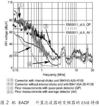乍看之下,在頻率從幾百kHz 到3 MHz 的范圍內,配有內置線圈的測試曲線令人驚訝。這是因為共模扼流圈,其電感量由其鐵氧體材料決定,不僅抑制共模干擾,而且具有非常低的漏感(漏感是由于部分磁場穿過空氣而不是鐵氧體介質所產生的)。這部分漏感并沒有受到線圈飽和的影響而繼續存在,但是它對其他因線圈飽和而超過限值的頻段幾乎毫無幫助。如果同一個變頻器使用同樣型號為BAOF的濾波器,但是去掉變頻器內部扼流圈,結果顯示就如圖2,這樣更容易滿足限值。