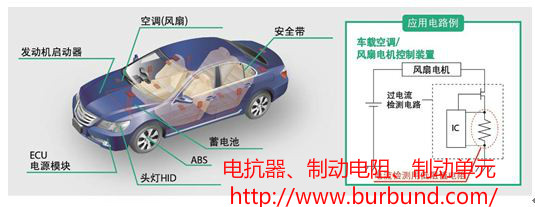 電流檢測用途的制動電阻主要用于電機驅動電路、電源的過電流保護及電池電量檢測。一直以來在汽車市場、工業設備市場、電腦市場等應用廣泛,尤其是在近年來的汽車市場,受電動汽車、混合動力車開發的帶動,在整個市場的應用的高性能化和電子化發展迅速。